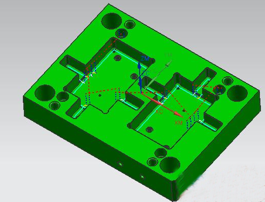 2 因四個行位槽有比較多的殘料需要加工,所以用D17R0.8進(jìn)行二次開粗