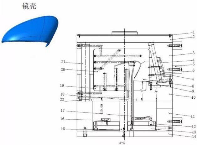 本模具采用推桿+推塊+斜推塊推出的脫模機(jī)構(gòu),這是汽車后視鏡鏡殼模具的典型結(jié)構(gòu),設(shè)計(jì)本類模具要注意,這種結(jié)構(gòu)必須是手