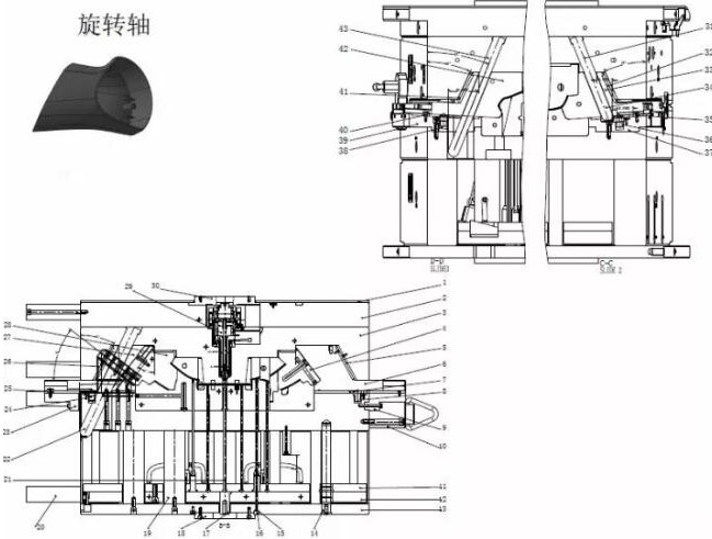 本模具采用推桿+推塊+推塊推出的脫模機(jī)構(gòu),這是汽車后視鏡支架模具的典型結(jié)構(gòu),設(shè)計(jì)本類模具要注意,這種結(jié)構(gòu)必須是手工